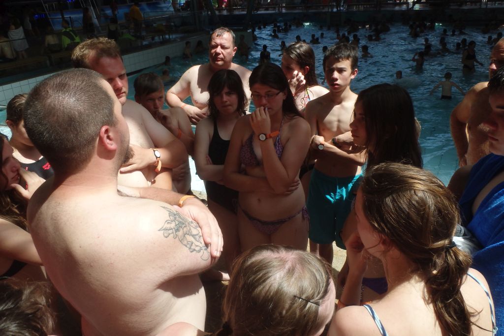 Doch unsere Pechsträne schien nicht ab zu reißen. Am Schwimmbad angekommen, ca. 11.00 Uhr, wurde uns mitgeteilt, das es verboten sei Essen und Trinken mit ins Bad zu nehmen und wir mussten unser gesamtes Picknick wieder zurück in die Busse bringen.