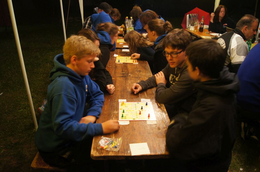 F.K. gibt während des Mensch Ärgere Dich Nicht Turniers die nächsten Gruppierungen bekannt: „A.W. spielt auf Feld drei mit Blau“