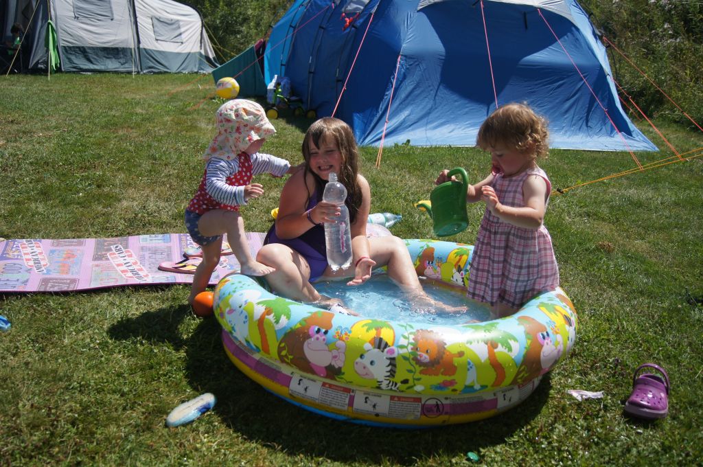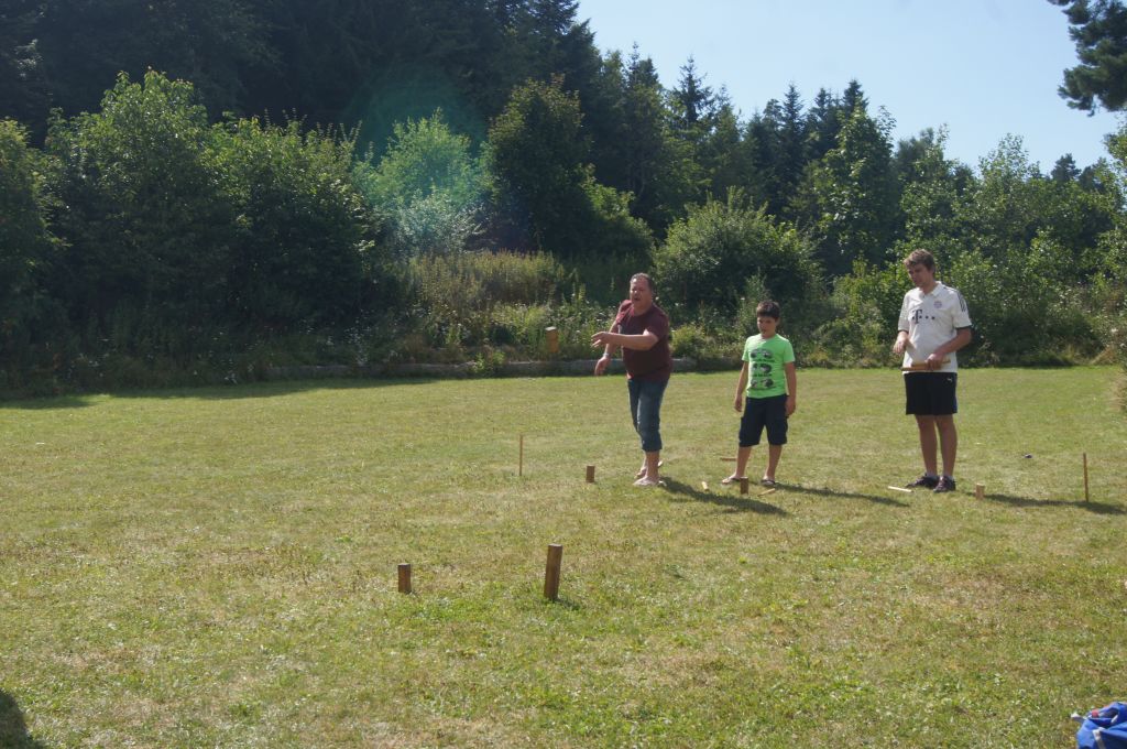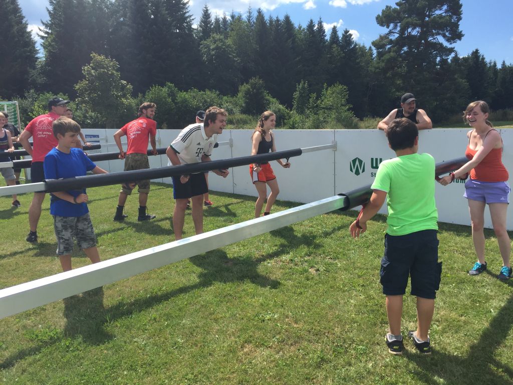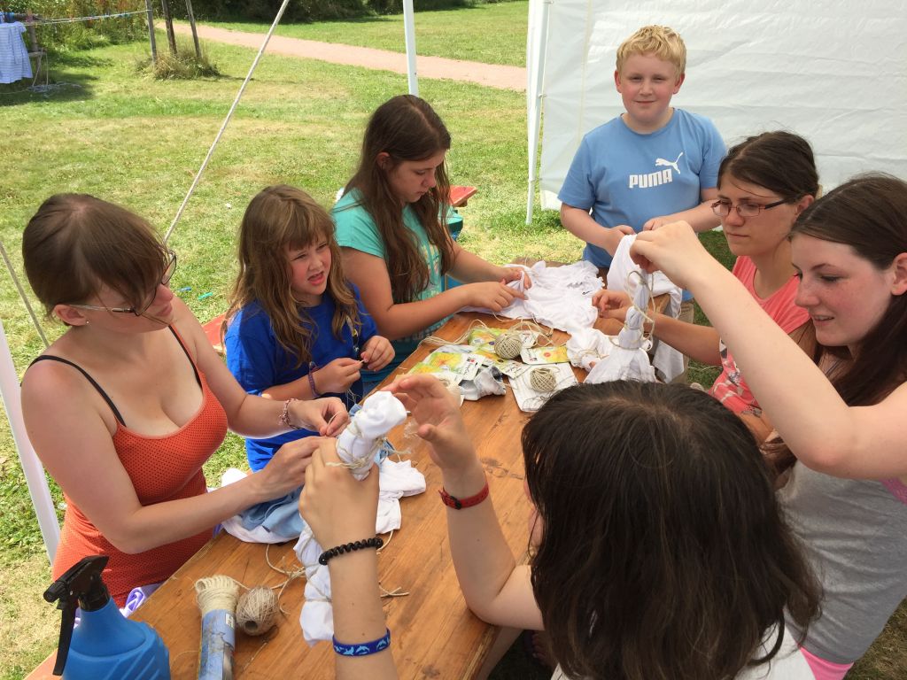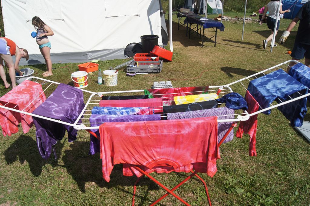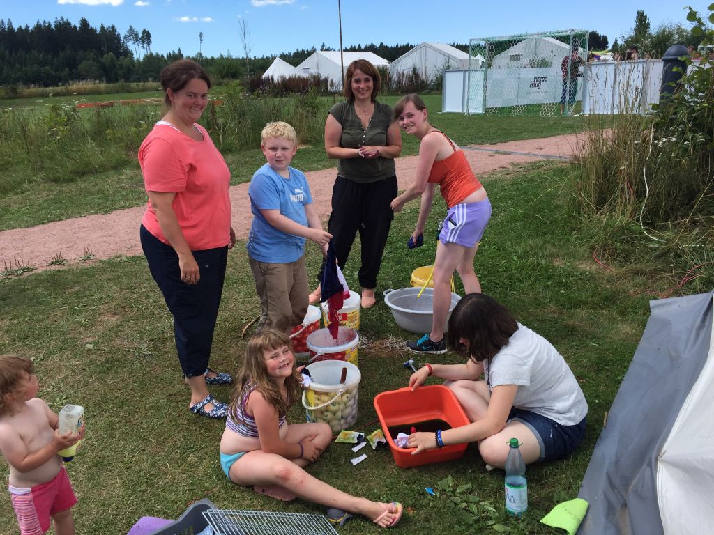 Nach unserem Mittagssnack starteten wir in den aufregenden Nachmittag. Unsere Zeltplatznachbarn brachten neben ihrer Zeltstadt auch ein großes Menschenkicker-Spielfeld mit. Darauf durften wir dann spielen. Zur selben Zeit wurde auf dem Zeltplatz gebatikt. So erstrahlten schon nach kurzer Zeit langweilige weiße T-Shirts, Hüte und Bodys in knallbunten Farben. Aber auch mit Sport ging es nach dem Kicker-Turnier weiter, so wurden Schwedenschach-Turniere veranstaltet und Wasserschlachten zwischen Küchenzelt und Pavillon abgehalten.