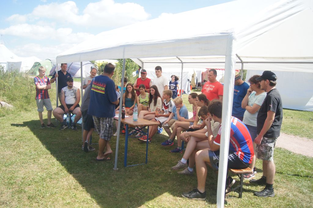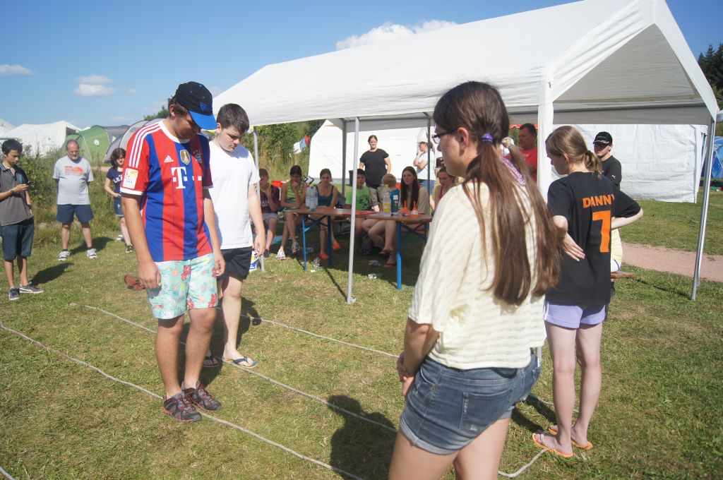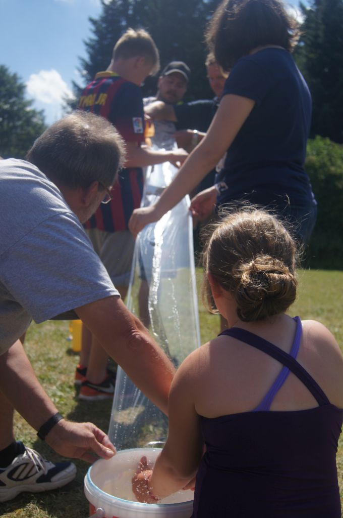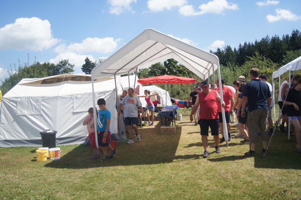 Und dann war es soweit: um 13.00 Uhr läuterte unsere berühmte Zeltlagerglocke zur Lagerolympiade, die von Kally und Harald vorbereitet wurde. Der Pavillon und ein Teil der Tische und Bänke wurden auf die Spielwiese gebracht und dann ging es auch schon mit den acht Spielen los. Zunächst jedoch wurden die Mannschaften ausgelost, wobei die vier jüngsten und ältesten Teilnehmer fest aufgeteilt und die allgemeinen Spielregeln erklärt wurden.