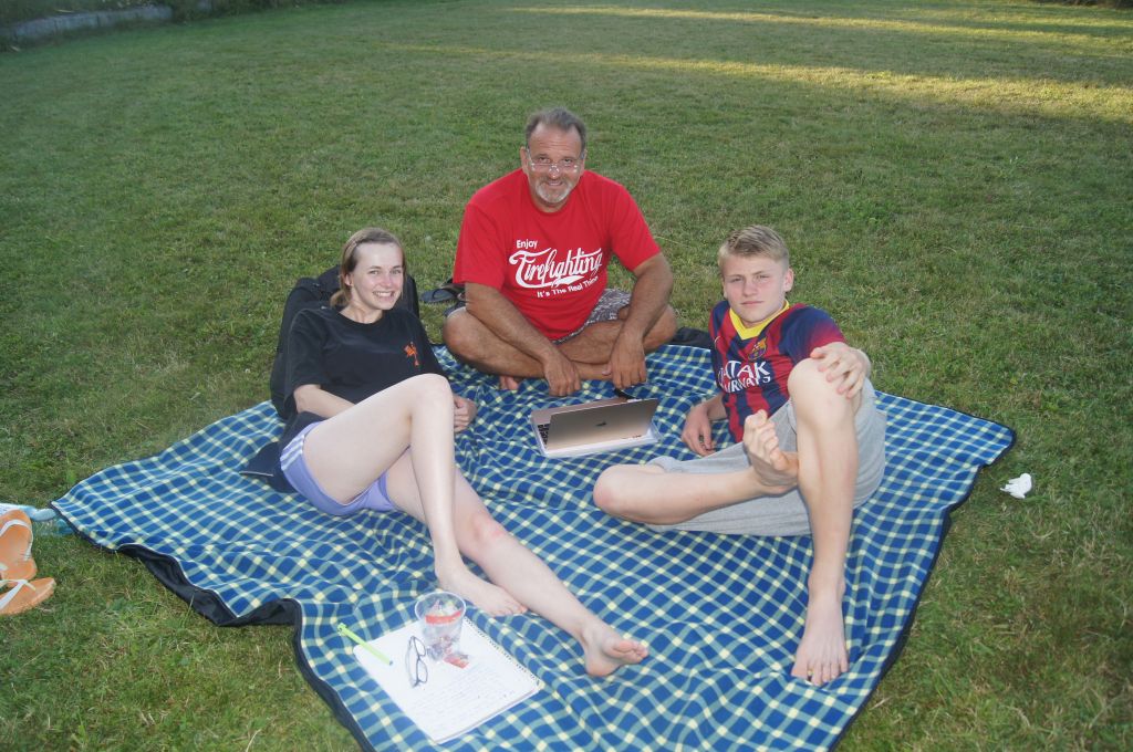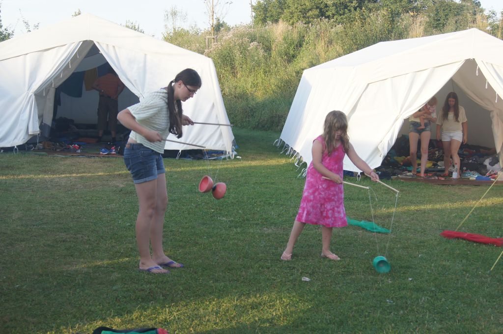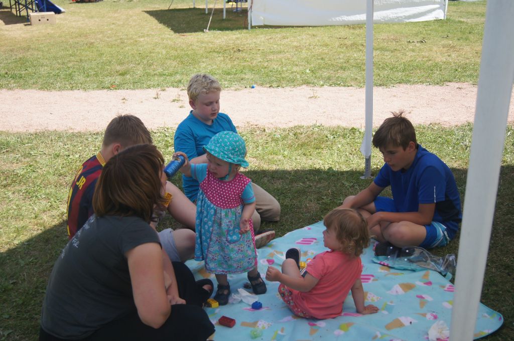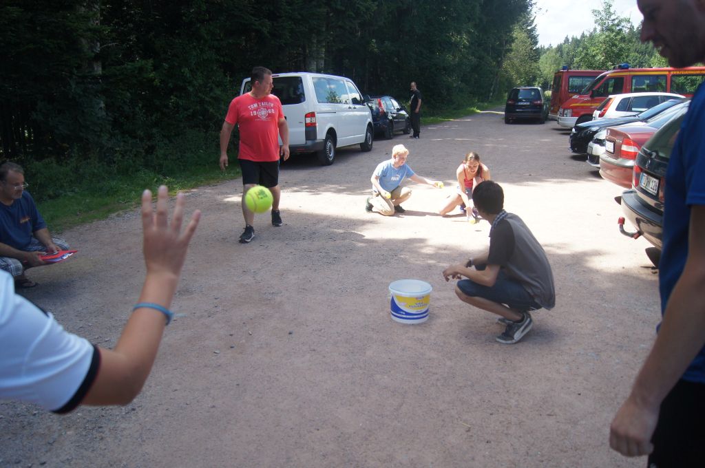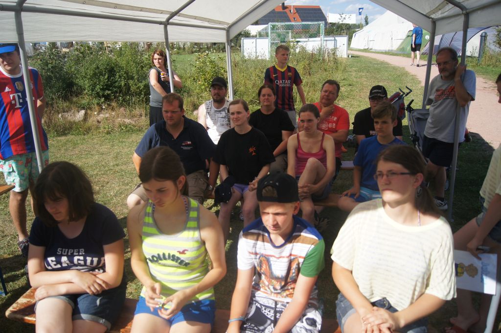 Und dann war es soweit: um 13.00 Uhr läuterte unsere berühmte Zeltlagerglocke zur Lagerolympiade, die von Kally und Harald vorbereitet wurde. Der Pavillon und ein Teil der Tische und Bänke wurden auf die Spielwiese gebracht und dann ging es auch schon mit den acht Spielen los. Zunächst jedoch wurden die Mannschaften ausgelost, wobei die vier jüngsten und ältesten Teilnehmer fest aufgeteilt und die allgemeinen Spielregeln erklärt wurden.