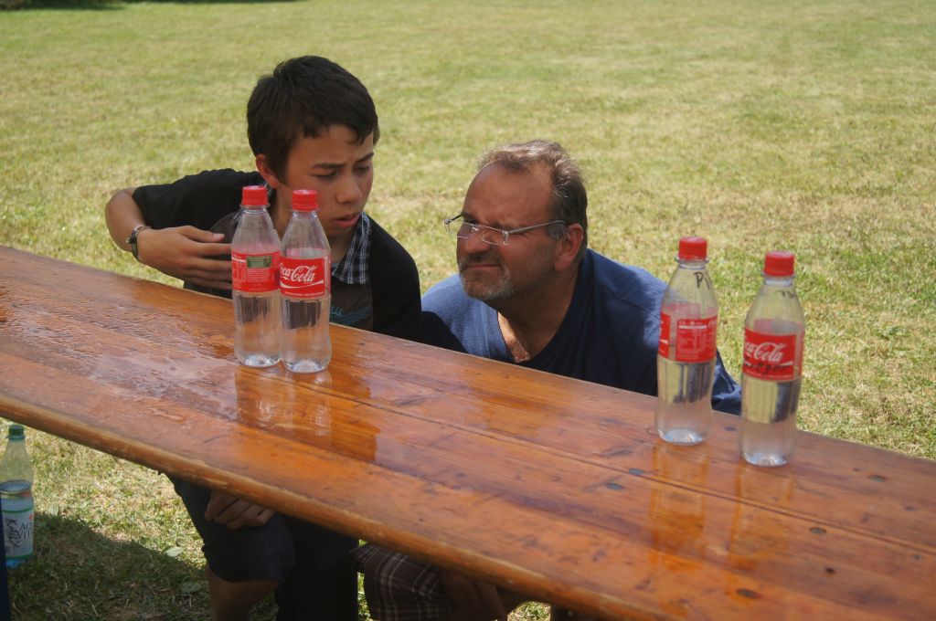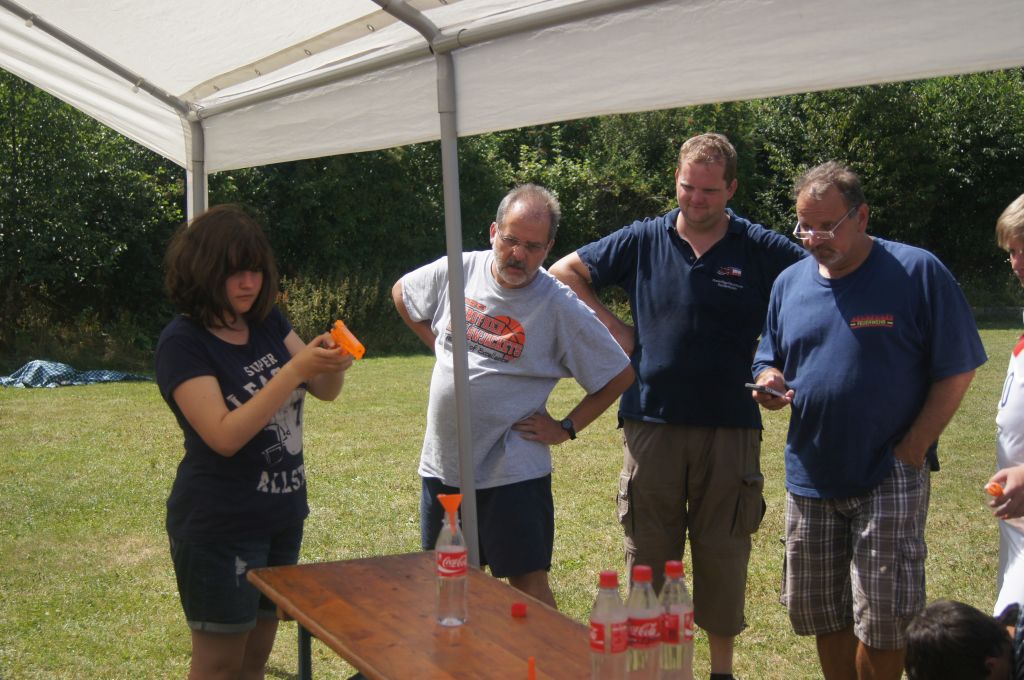 Im nächsten Spiel musste mit Hilfe von Wasserpistolen Wasser über vier verschieden große Trichter in eine leere Flasche gespritzt werden – kein ganz einfaches Unterfangen, wenn man sich für den kleinsten Trichter entschieden hat …