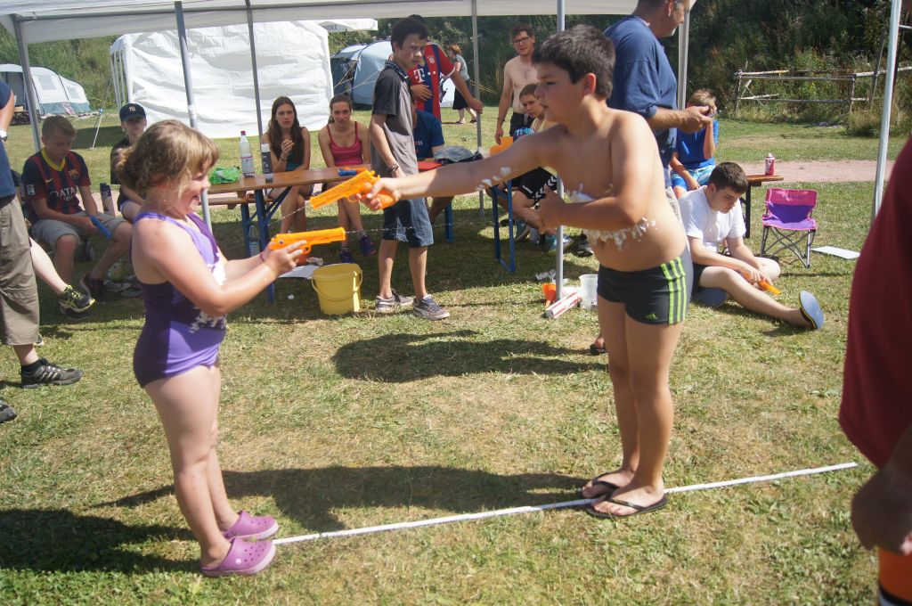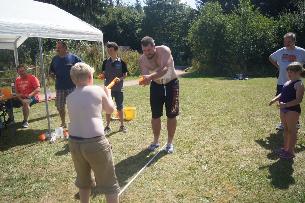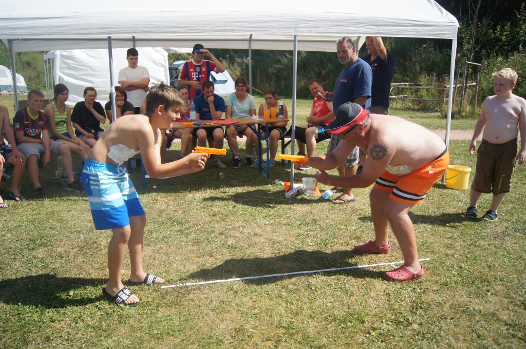 Und jetzt wurde es noch einmal nass: mit Hilfe von Wasserpistolen musste auf dem Bauch aufgetragener Rasierschaum vom Gegner abgespritzt werden – der hatte allerdings auch eine Wasserpistole und wehrte sich …