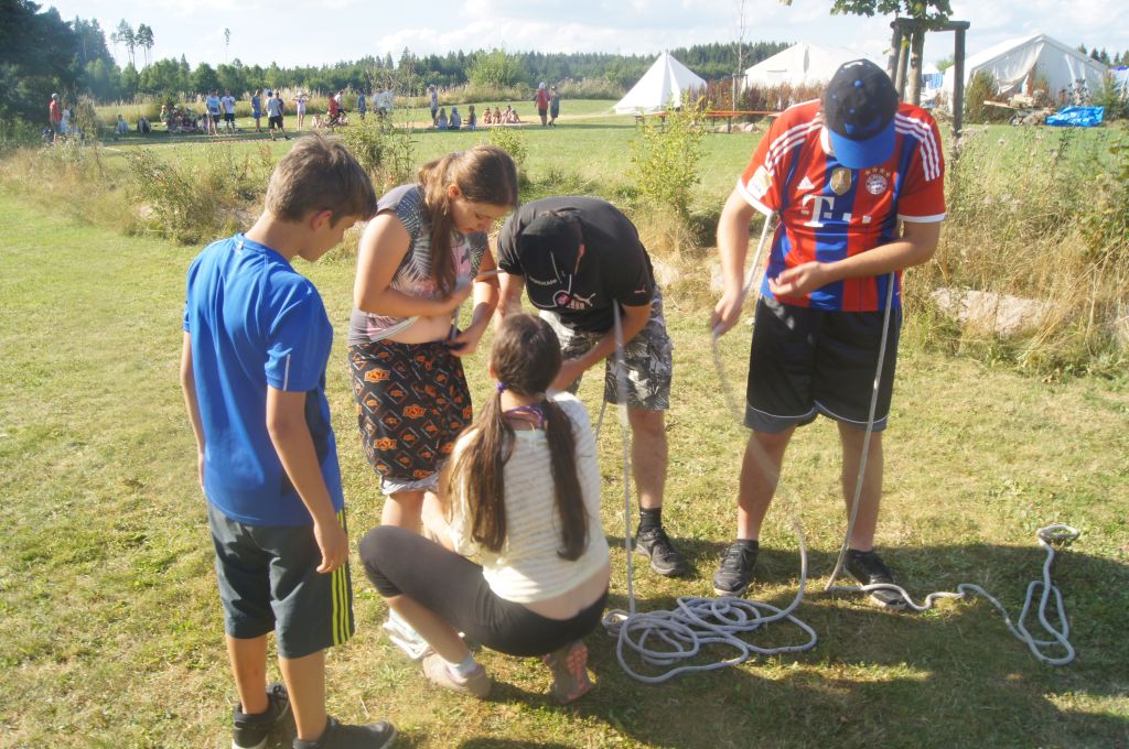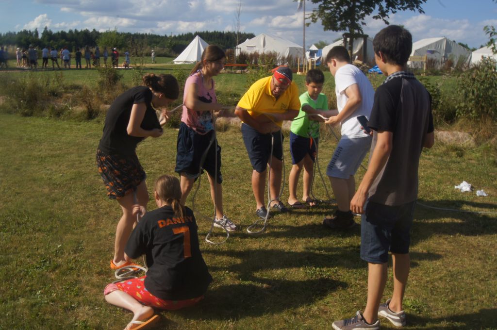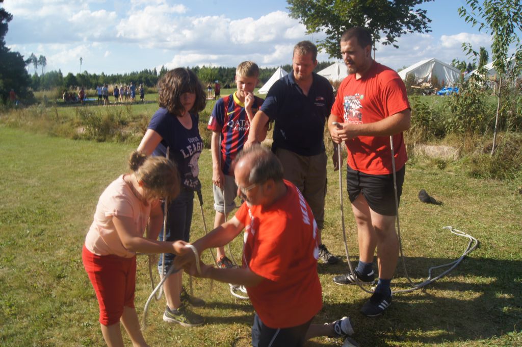 Das letzte Spiel forderte dann noch einmal alle Teilnehmer. Eine Feuerwehrleine musste durch die T-Shirts und Hosen aller fünf Spieler einer Mannschaft gefädelt werden (so dass sich unter der Kleidung ein Kreuz bildete) und danach vom sechsten Spieler mit einem Feuerwehrknoten versehen werden.