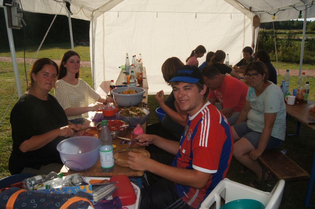 Das Abendessen wurde vom Küchendienst und einigen Freiwilligen hergerichtet. Es wurden Schnitzel geklopft und paniert, Salatdressing angerührt, die dazugehörige Sauce zubereitet und der Obstsalat wurde geschnippelt. Und so gab es dann kurz danach ein leckeres Abendessen für alle Teilnehmer.